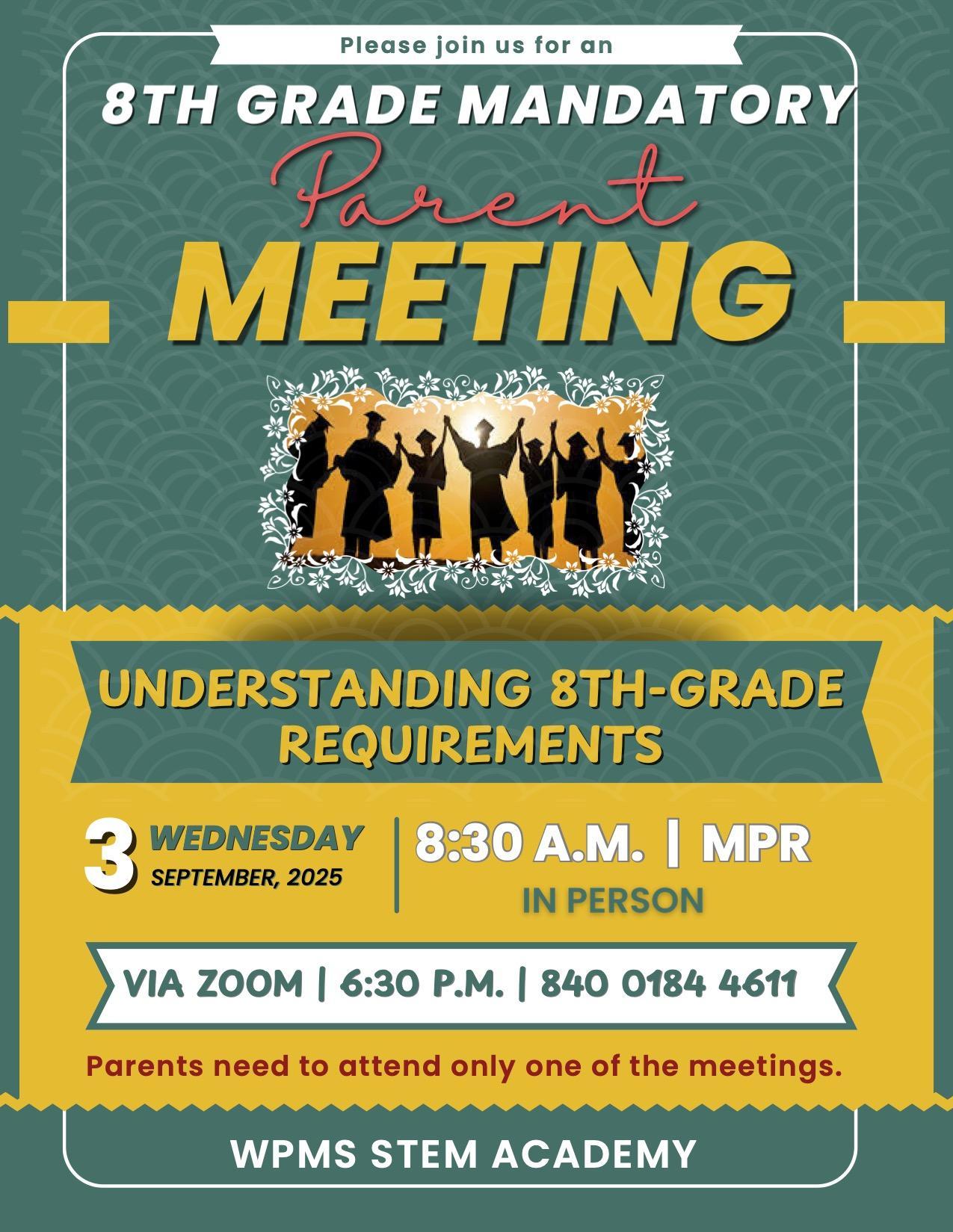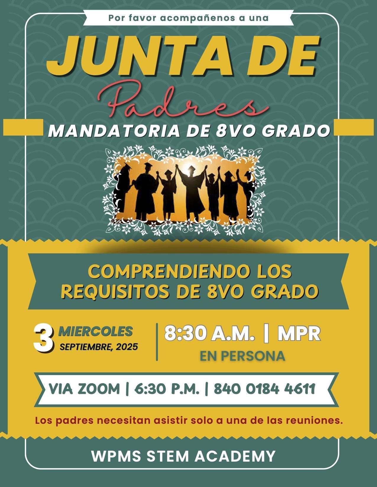 8th Grade Requirements Parent Meeting 9/3 Click here to join our meeting through Zoom Haga clic aquí para unirse a nuestra reunión a través de Zoom